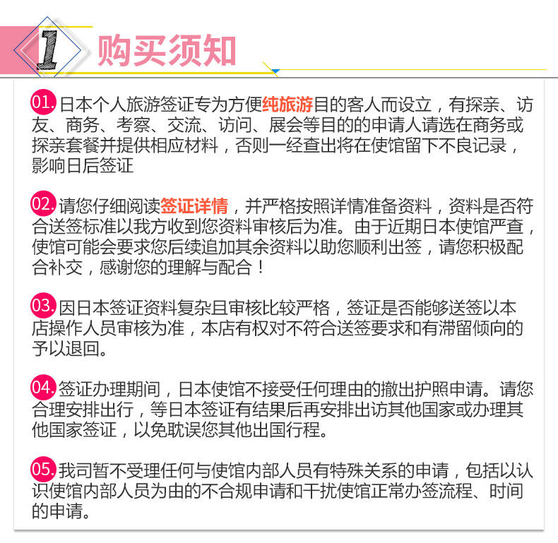 1、日本个人旅游签证专为方便纯旅游目的客人而设立,有探亲、访友、商务、考察、交流、访问、展会等目的的申请人请选在商务或探亲套餐并提供相应材料,否则一经查出将在使馆留下不良记录,影响日后签证。
