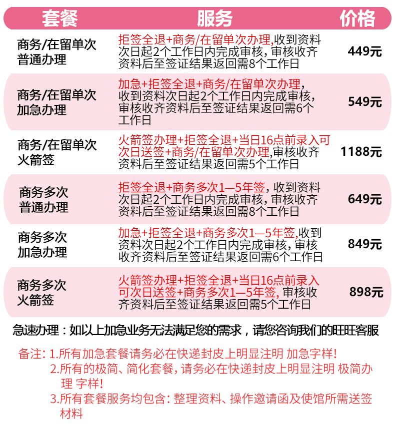 商务/在留单次,拒签全退,加急办理,初审2+进馆后6个工作日 |