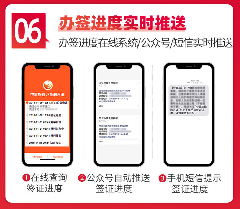 2 签证办理完成后统一短信通知结果,不能自取请在收到通知短信后致电4006006666告知邮寄地址(内容包括:订单号码/申请人姓名/详细地址/收件人/联系电话)。不接受快递到付!